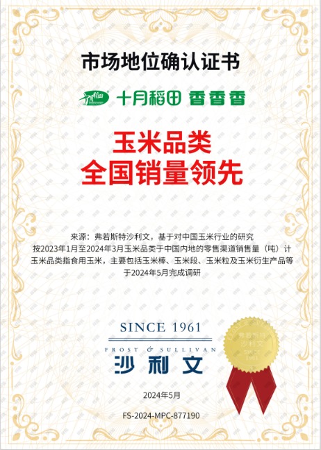 根据弗若斯特沙利文数据,截至2024年5月,十月稻田玉米品类全国销量领先。此外,抖音平台数据显示,截至2025年1月,十月稻田黄糯玉米单品链接累计销量已超过1200万单。