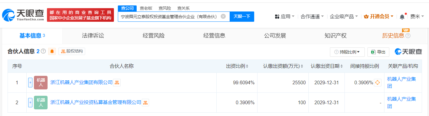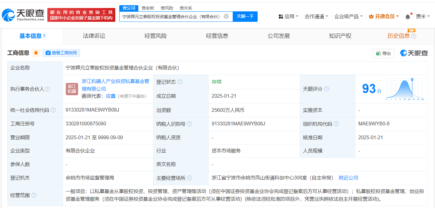 每经ai快讯,天眼查app显示,近日,宁波舜元立泰股权投资基金管理合伙企业(有限合伙)成立,执行事务合伙人为浙江机器人产业投资私募基金管理有限公司,出资额2.56亿元人民币,经营范围为以私募基金从事股权投资、投资管理、资产管理等活动,私募股权投资基金管理、创业投资基金管理服务,由浙江机器人产业集团有限公司及旗下浙江机器人产业投资私募基金管理有限公司共同出资。