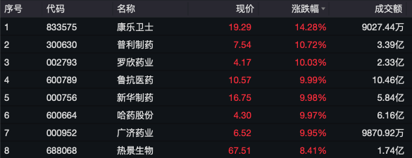 仿制药、减肥药、创新药、维生素等板块也全线上攻,罗欣药业、康乐卫士、普利制药等个股涨停或涨超10%。