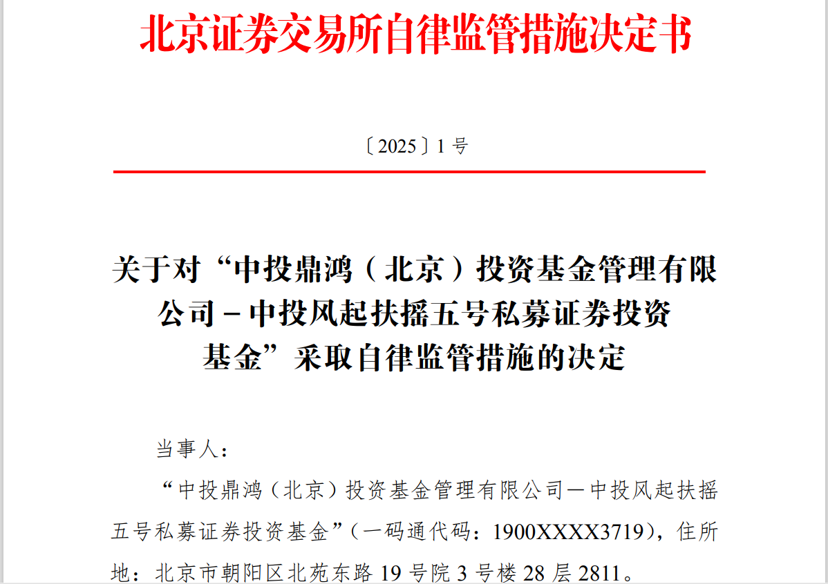3月17日,北交所k8凯发赢家一触即发官网连续发布两则自律监管措施决定,分别涉及“中投鼎鸿(北京)投资基金管理有限公司-中投风起扶摇五号私募证券投资基金”与“华睿千和(天津)资产管理有限公司-华睿千和量化中性二号私募证券投资基金”。