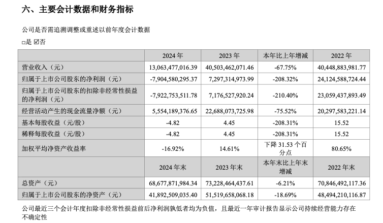 3月26日晚间,天齐锂业股份有限公司(以下简称“天齐锂业”或“公司”)发布2024年年度报告。报告期内,公司实现营业总收入130.63亿元,同比下降67.75%;实现归属于上市公司股东的净利润为-79.05亿元,同比下降208.32%。净亏损79.05亿元是天齐锂业上市以来最亏业绩,亏掉上一年全年利润不止。