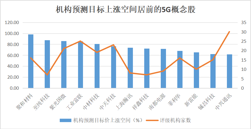 根据3家及以上机构一致预测,29只5g概念股,最新收盘价较目标价上涨空间超50%,聚和材料、至纯科技、紫光国微、工业富联、中材科技的上涨空间高达80%。聚和材料近日在投资者互动平台表示,子公司匠聚公司的泛半导体领域用厚膜电子浆料,已经在射频器件(如5g滤波器)等领域实现量产。