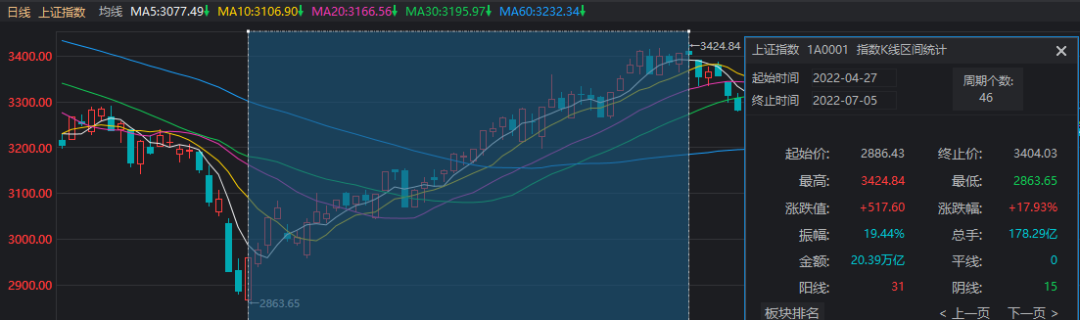 举个真实的例子——2022年4月底开启的那波大行情,2个多月时间,沪指从2863点一路涨到3424点,累计涨幅逼近“技术性牛市”的门槛。