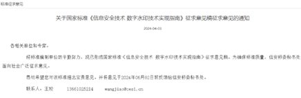 日前,全国网络安全标准化技术委员会就国家标准《信息安全技术数字水印技术实现指南》(以下简称“标准”)公开征求意见。