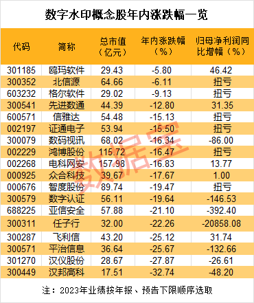 数字水印相关概念股今年内行情表现也较差,如汉仪股份、平冶信息、智度股份、数字认证等个股跌幅均超19%。