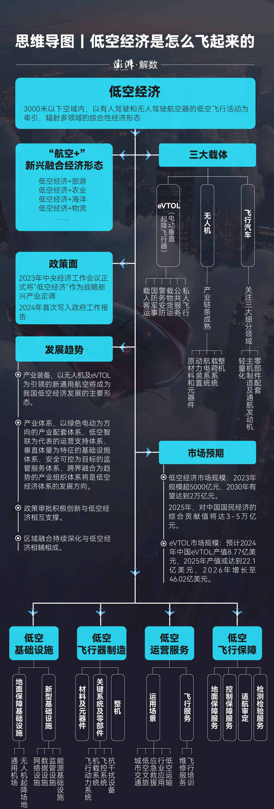 据澎湃新闻记者梳理,上述多个省市的行动方案或是高质量发展举措中,都强调要壮大低空经济产业链,大部分提及要支持加强低空基础设施建设,包括空域网络、起降场地、各类平台等。有的还指出,要完善飞行保障/监管体系、加强创新能力建设、培育低空经济应用场景等。