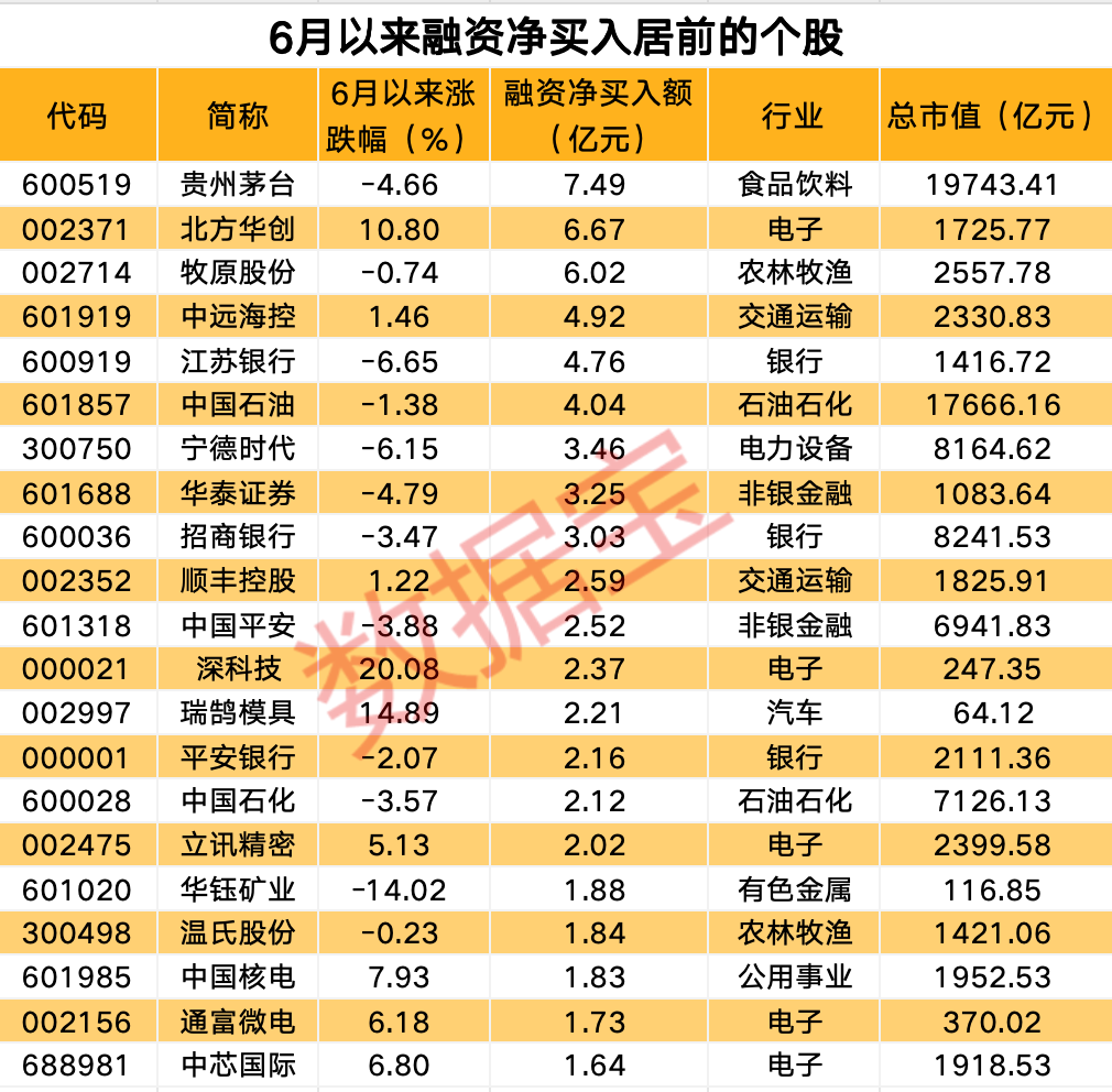 据证券时报·数据宝统计,6月以来,融资资金净买入1210股,净买入29股超1亿元。贵州茅台、北方华创、牧原股份获融资资金净买入额居前,分别达到7.49亿元、6.67亿元、6.02亿元。