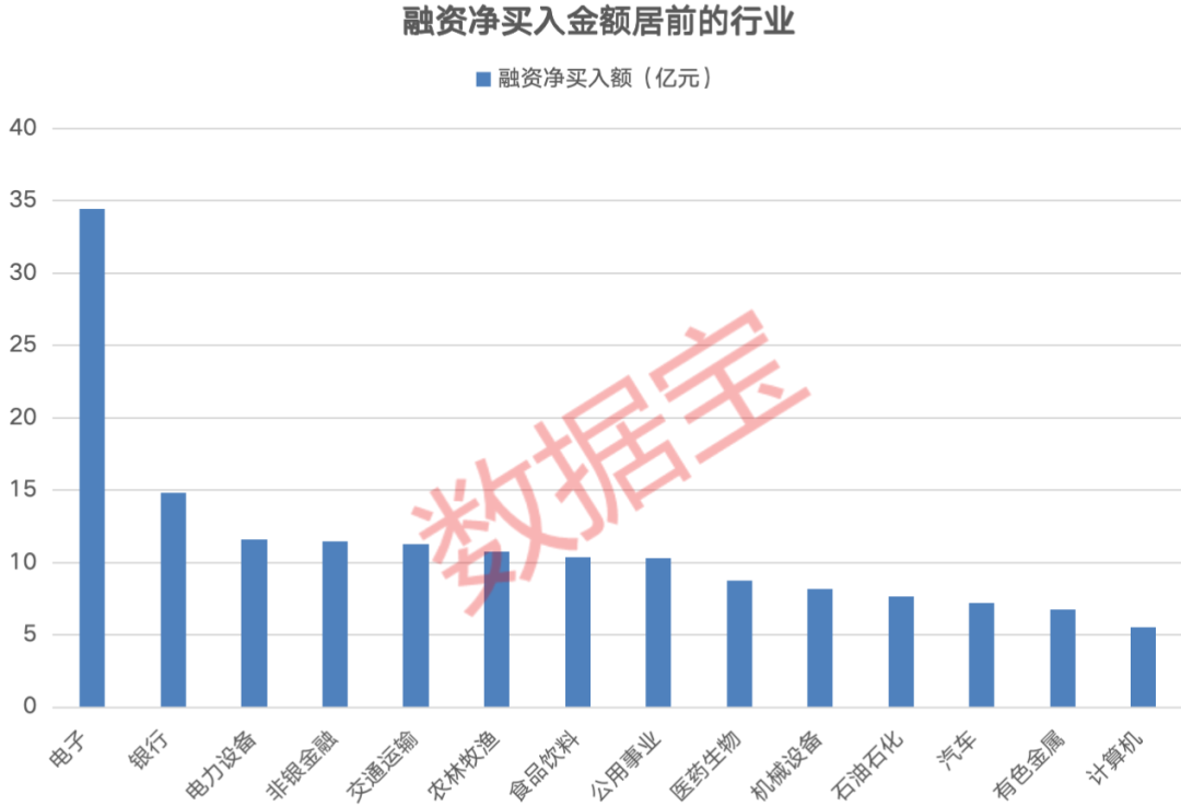 分行业来看,电子行业获融资客净买入34.42亿元,居首。其他还有银行、电力设备、非银金融等七大行业获融资客净买入均超10亿元。