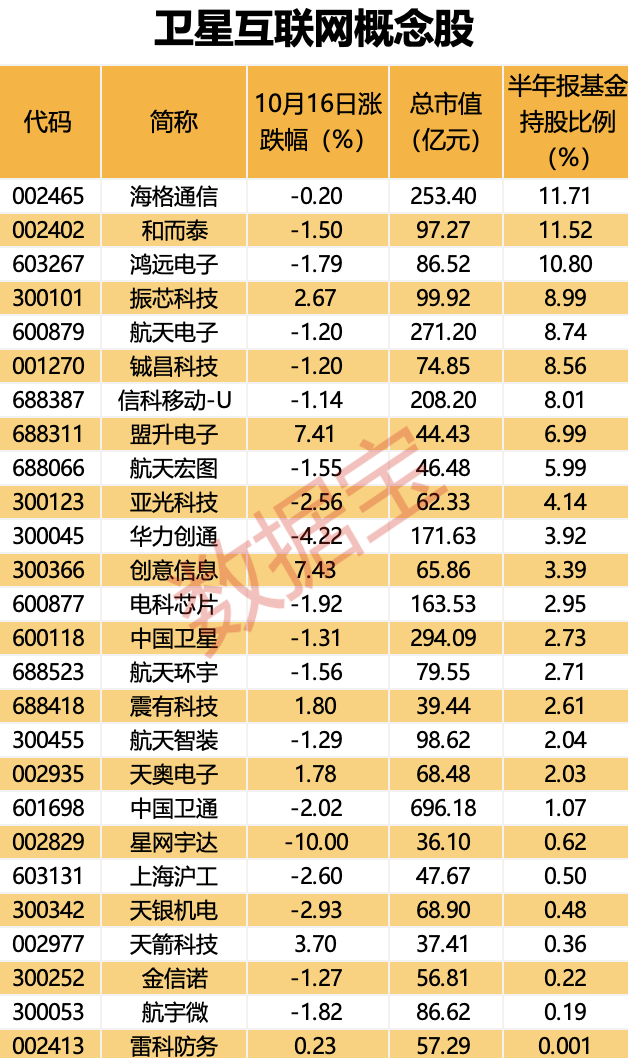 从机构持仓情况来看,部分卫星互联网概念股获得公募基金青睐,9股上半年末基金持股比例在5%以上,海格通信、和而泰、鸿远电子的基金持股比例居前,分别为11.71%、11.52%、10.8%。