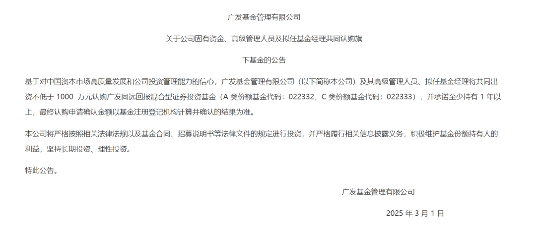 3月1日,广发基金公告称,基于对中国资本市场高质量发展和公司投资管理能力的信心,广发基金及其高级管理人员、拟任基金经理将共同出资不低于1000万元认购广发同远回报混合基金,并承诺至少持有1年以上。