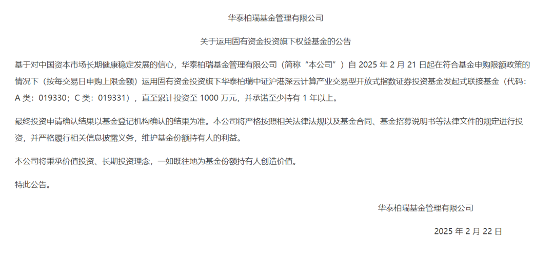 除了自购新发基金以外,基金管理人也在自购旗下老基金。2月22日,华泰柏瑞基金公告称,基于对中国资本市场长期健康稳定发展的信心,华泰柏瑞基金自2月21日起在符合基金申购限额政策的情况下(按每交易日申购上限金额),运用固有资金投资旗下华泰柏瑞中证沪港深云计算产业etf联接基金,直至累计投资至1000万元,并承诺至少持有1年以上。