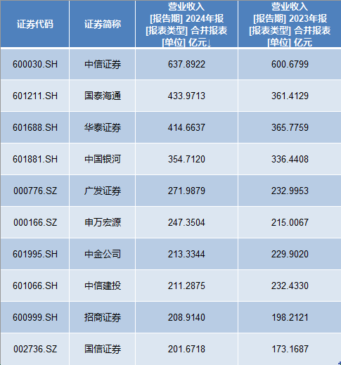广发证券、申万宏源、中金公司、中信建投、招商证券、国信证券2024年营收均超过200亿元,分别为271.99亿元、247.35亿元、213.33亿元、211.29亿元、208.91亿元和201.67亿元。