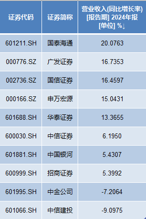 其中,国泰海通、广发证券、国信证券、申万宏源、华泰证券去年营收同比增幅均超过10%,分别达20.08%、16.74%、16.46%、15.04%、13.37%。