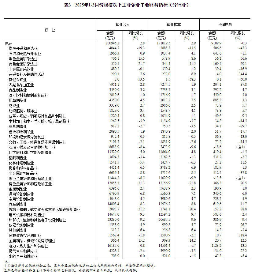 1—2月份,全国规模以上工业企业实现利润总额9109.9亿元,同比下降0.3%(按可比口径计算,详见附注二)。