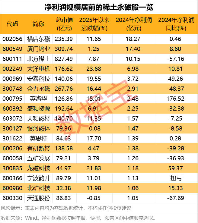据证券时报·数据宝统计,在a股市场中,2024年盈利超1亿元的稀土永磁股共有17只(净利润数据按照年报、快报、预告区间中值顺序选取)。其中,横店东磁、厦门钨业、北方稀土净利润规模超过10亿元,依次为18.27亿元、17.4亿元、10.15亿元。