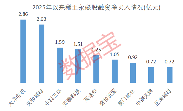 从融资净买入额来看,2025年以来,6只稀土永磁股融资净买入额过亿元。大洋电机、天磁材居前,金额均超过2亿元。