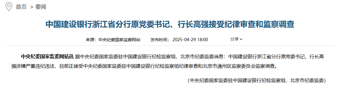 4月29日,中央纪委国家监委网站通报,据中央纪委国家监委驻中国建设银行纪检监察组、北京市纪委监委消息:中国建设银行(601939)浙江省分行原党委书记、行长高强涉嫌严重违纪违法,目前正接受中央纪委国家监委驻中国建设银行纪检监察组纪律审查和北京市通州区监察委员会监察调查。