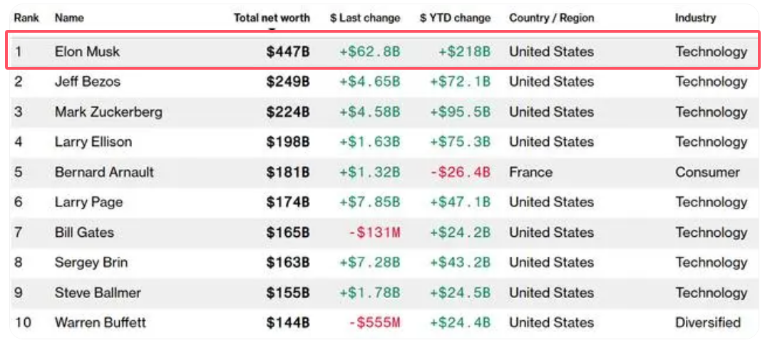 彭博亿万富翁指数显示,截至当地时间12月11日,全球首富、特斯拉ceo马斯克的净资产已达4470亿美元,成为全球身家超4000亿美元“第一人”,较居次位的杰夫·贝索斯高出1980亿美元,年初至今累计增加2180亿美元。