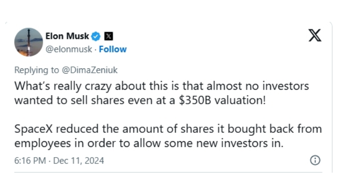 马斯克在社交媒体上回复有关spacex股票出售的帖子时写道,在3500亿美元的新估值下,几乎没有投资者愿意出售股票。“spacex减少了从员工手中回购的股票数量,以允许一些新投资者进入。”
