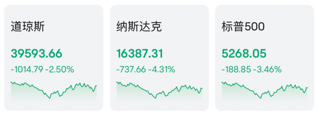 美东时间4月10日,美股全线大跌,纳指盘中一度暴跌超7%,截至收盘,道指跌2.5%,标普500指数跌3.46%,纳指跌4.31%。