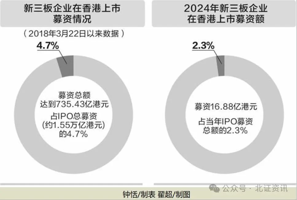 统计显示,自2018年起,已有74家新三板企业成功登陆港股,包括已摘牌、持续挂牌或控制新三板企业的公司,累计募资约735.43亿港元。进入2025年,八马茶业、印象股份、奥克斯、健康160、大众口腔等知名企业也纷纷加入赴港上市大军。