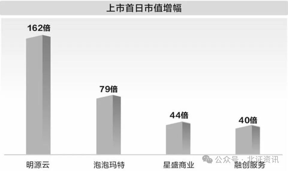 据livereport大数据的统计,从上市首日市值增幅来看,这些企业港股上市首日市值较新三板摘牌市值平均增长9.85倍,其中市值增幅最大的是明源云,市值增长高达162倍,泡泡玛特、星盛商业、融创服务都分别增长了约79倍、44倍、40倍。