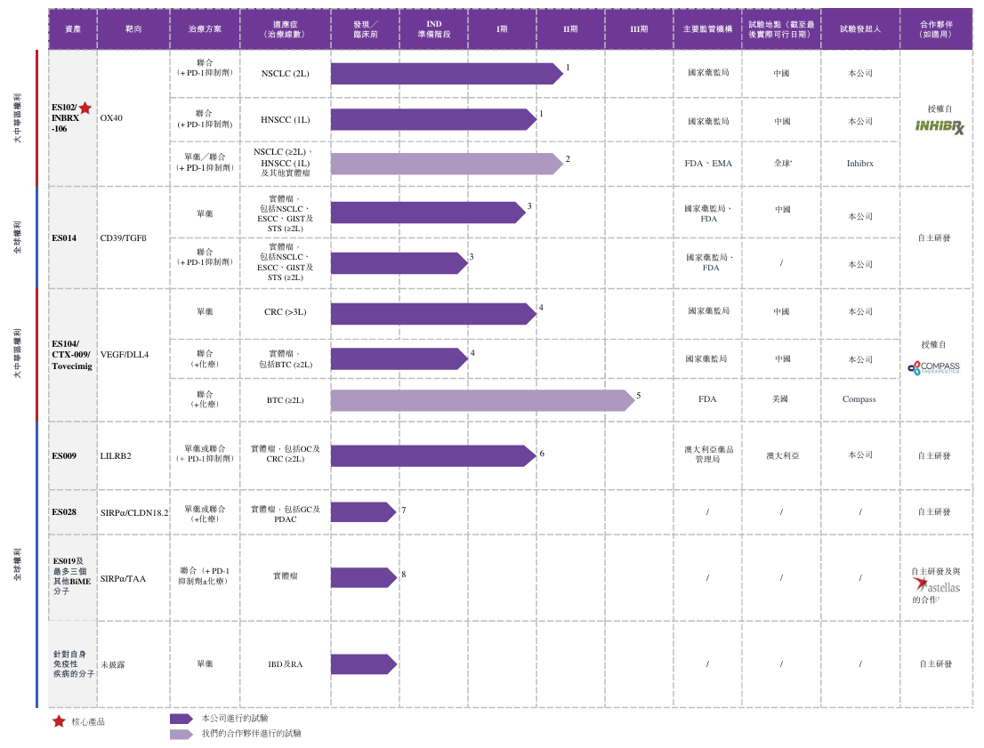 科望医药4个临床阶段的产品分别为es102、es014、es104、es009,两个临床前阶段产品分别为es028、es019及最多三个其他bimemolecules。
