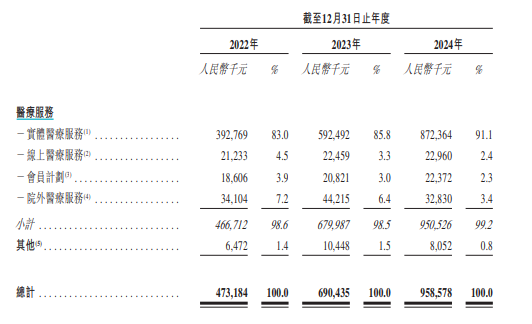 从营收组成来看,卓正医疗的收入主要来自向客户提供医疗服务,包括实体医疗服务、线上医疗服务、会员计划、院外医疗服务等。2022年—2024年,卓正医疗营业收入分别为4.73亿元、6.90亿元、9.59亿元,年复合增长率达42.3%。其中,实体医疗服务在营收中占比超80%,且比例逐年提升,2024年营收占比增至91.1%。
