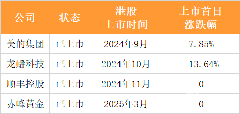 从赴港上市首日的股价表现来看,龙蟠科技(hk02465)收跌13.64%,顺丰控股(hk06936)和赤峰黄金(hk06693)平收,美的集团(hk00300)则收涨7.85%。