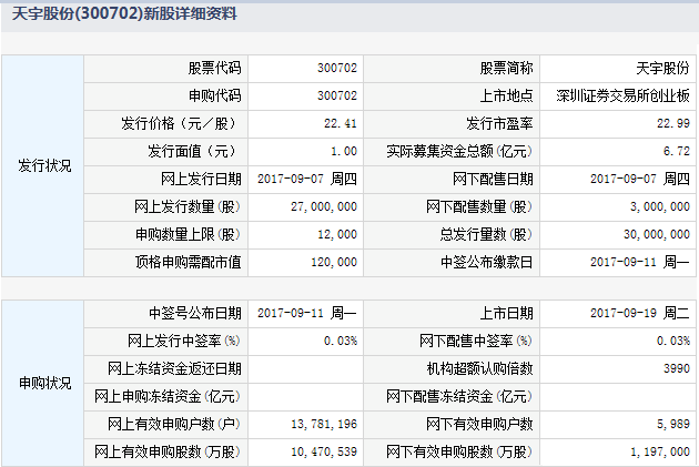 根据交易所公告,浙江天宇药业股份有限公司于2017年9月19日起在深圳证券交易所创业板上市交易。