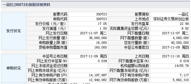 根据交易所公告,一品红药业股份有限公司于2017年11月16日起在深圳证券交易所创业板上市交易。