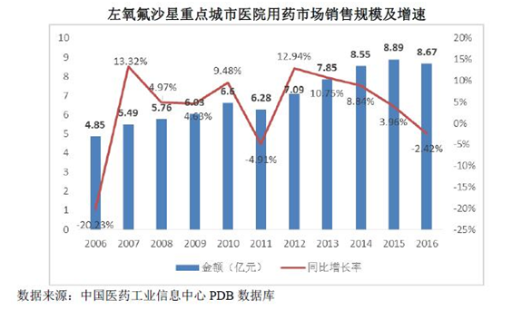 2,3,4,5-四氟苯甲酰氯产品作为制备氧氟沙星、左氧氟沙星的主要中间体,其市场与氧氟沙星及左氧氟沙星的市场发展紧密相关。近十年,我国左氧氟沙星重点城市医院用药市场销售规模及增速如下图所示: