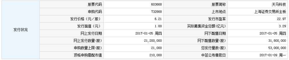 根据交易所公告,福建天马科技集团股份有限公司于2017年1月17日起在上海证券交易所主板上市。公司首次公开发行不超过5,300万股,本次发行价格为6.21元/股,市盈率为22.97倍。股票简称为“天马科技”,股票代码为“603668”。