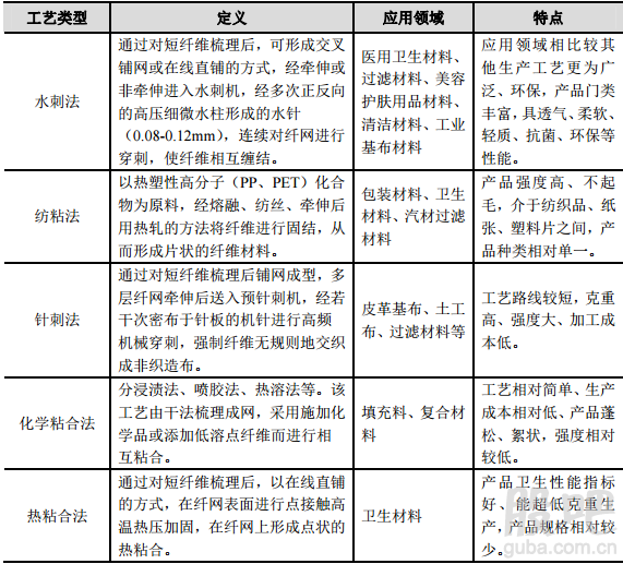 非织造布行业按照产品生产工艺不同主要分为水刺、纺粘、针刺、化学粘合、热粘合等方法。各工艺方法的定义及特点简要介绍如下(公司主要为水刺法):