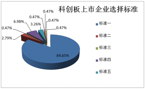 上述215家科创板上市企业中,选择上市标准一的企业占比84.65%,选择上市标准二的企业占比2.79%,选择上市标准三的企业占比0.47%,选择上市标准四的企业占比6.98%,选择上市标准五的3.26%。