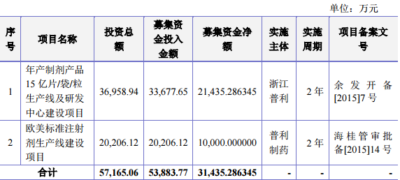根据招股书披露,普利制药拟公开发行人民币普通股3052.9405万股(发行价格待定),本次募集资金将用于两个项目的建设,即年产制剂产品15亿片/袋/粒生产线及研发中心建设项目,和欧美标准注射剂生产线建设项目,具体投入金额及实施方式如下。