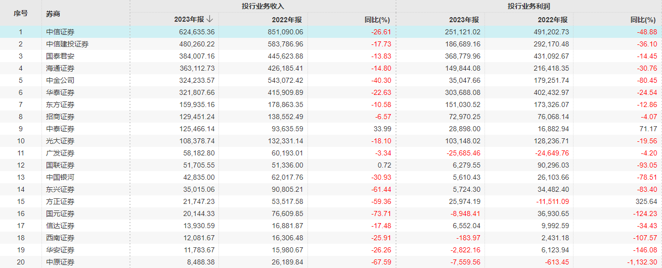 数据显示,截至4月7日,目前已披露2023年年报的21家券商,有19家券商2023年的投行业务收入出现负增长,同比降幅超过10%的更是多达17家,仅中泰证券(600918)和国联证券(601456)实现了同比正增长。