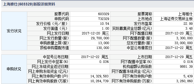 根据交易所公告,上海雅仕投资发展股份有限公司于2017年12月29日起在上海证券交易所主板上市交易。
