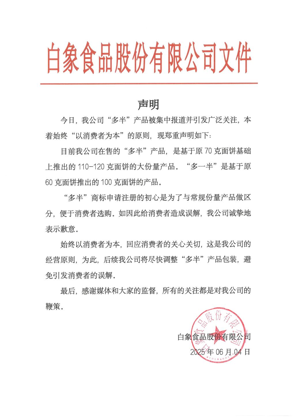 6月4日晚间,白象食品股份有限公司发布声明称,目前公司在售的“多半”产品,是基于原70克面饼基础上推出的110-120克面饼的大份量产品,“多一半”是基于原60克面饼推出的100克面饼的产品。