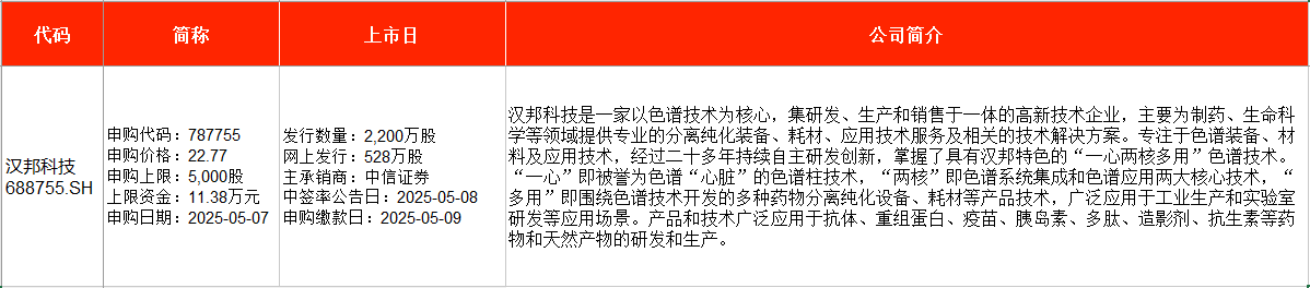 从时间表看,汉邦科技在周三(5月7日)申购,太力科技、威高血净则在周四(5月8日)申购。