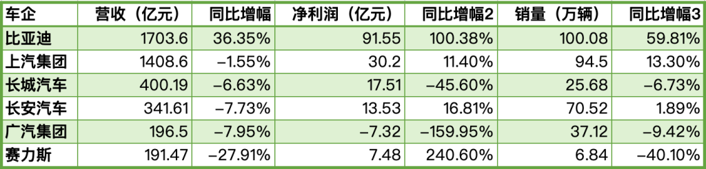 营收方面仅有比亚迪实现同比增长,增幅为36.35%。