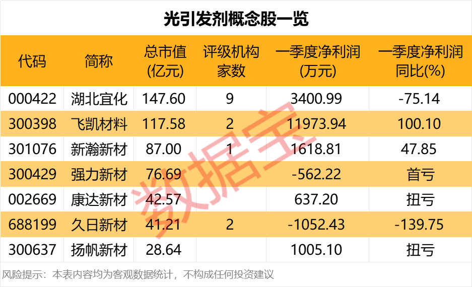 据证券时报·数据宝不完全统计,a股市场参与光引发剂生产的上市公司主要有7家,其中久日新材、强力新材、扬帆新材为国内龙头,此外,新瀚新材、飞凯材料、康达新材、湖北宜化也有相关产品。