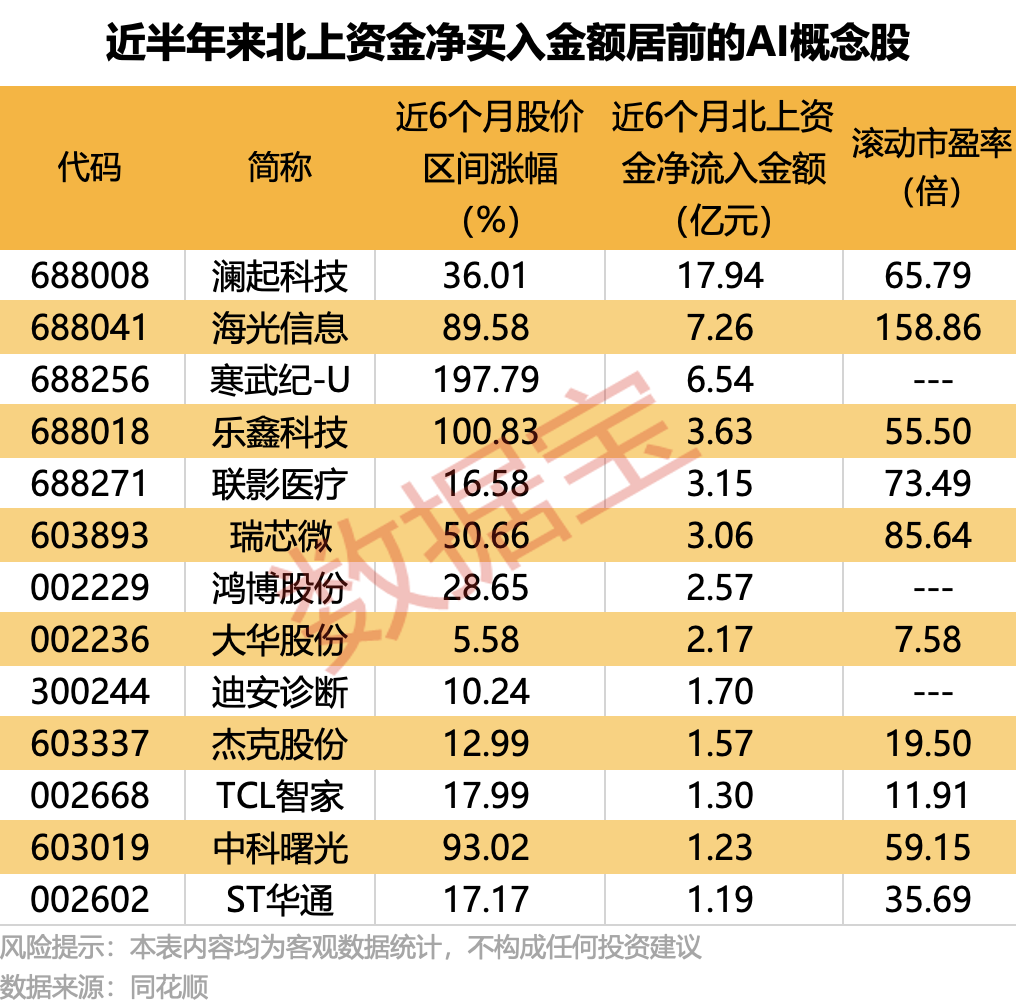 此外,数据显示,截至12月9日,人工智能概念板块中,近6个月以来,股价区间涨幅翻倍的有86只,其中,赢时胜、汇金科技和银之杰涨幅最为突出,均超过了5倍;在此期间,北上资金净流入金额超过1亿元的有17只,澜起科技、海光信息和寒武纪-u排在前三位。