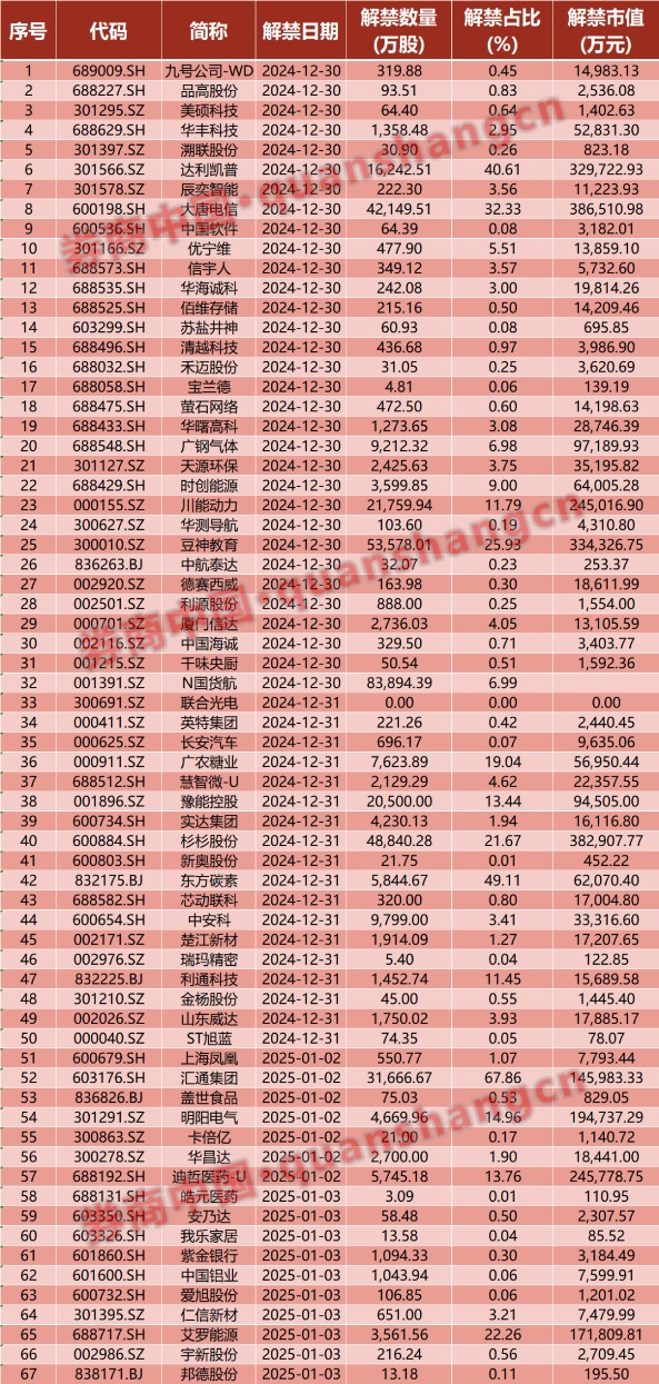本周(12月30日到1月3日)a股市场将有67只股票面临限售股解禁,合计解禁数量为40.05亿股,按最新收盘价计算,合计解禁市值为328.84亿元。从解禁股情况来看,大唐电信、杉杉股份、豆神教育、达利凯普解禁市值将均超30亿元。
