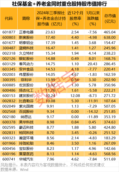 按持股市值来看,正泰电器、新奥股份、明泰铝业等14股社保 养老金持股市值达到10亿元以上。正泰电器持股市值最高,获养老金持股8.41亿元,社保基金持股15.22亿元。公司业绩表现较好,2024年三季报实现归母净利润34.98亿元,同比增长16.93%。