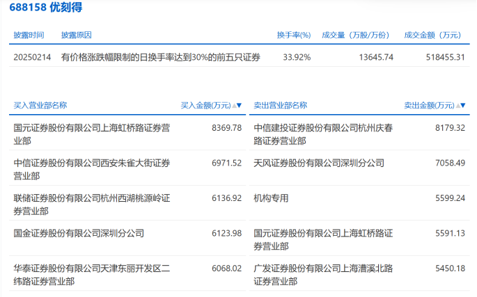 2月14日,优刻得因日换手率达到30%而上榜,龙虎榜显示,2月14日,买入前五中并无机构席位,有一机构卖出5599.24万元。买入前五的营业部分别是国元证券股份有限公司上海虹桥路证券营业部、中信证券股份有限公司西安朱雀大街证券营业部、联储证券股份有限公司杭州西湖桃源岭证券营业部、国金证券股份有限公司深圳分公司、华泰证券股份有限公司天津东丽开发区二纬路证券营业部。