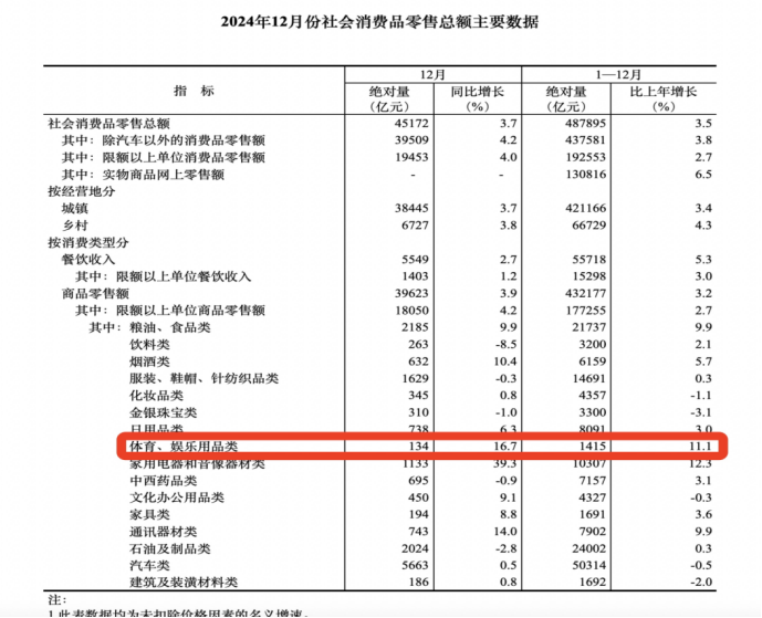 国家统计局公布的数据显示,2024年全年,我国体育、娱乐用品类消费支出实现了11.1%的显著增长。