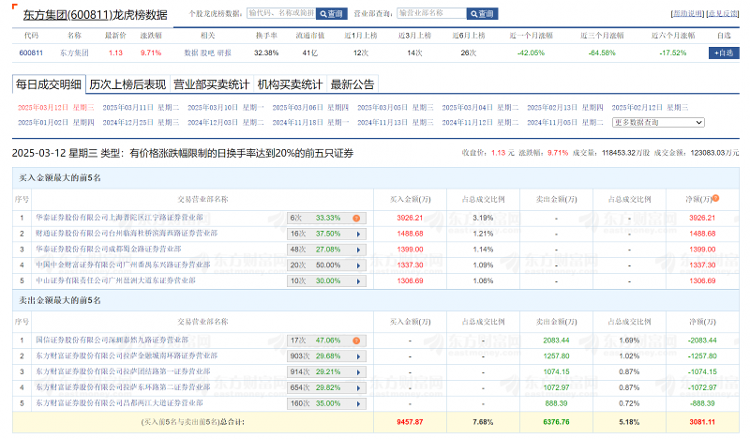 东方集团3月12日龙虎榜数据(来源:东方财富)
