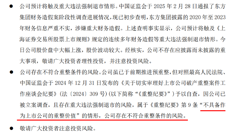 这场 “地天板” 行情引发市场震动,而公司午间紧急发布的风险提示公告更令投资者困惑 —— 公告称,公司预计将触及重大违法强制退市情形,且存在不符合重整条件的风险。在退市风险高悬的背景下,是谁在逆势炒作?