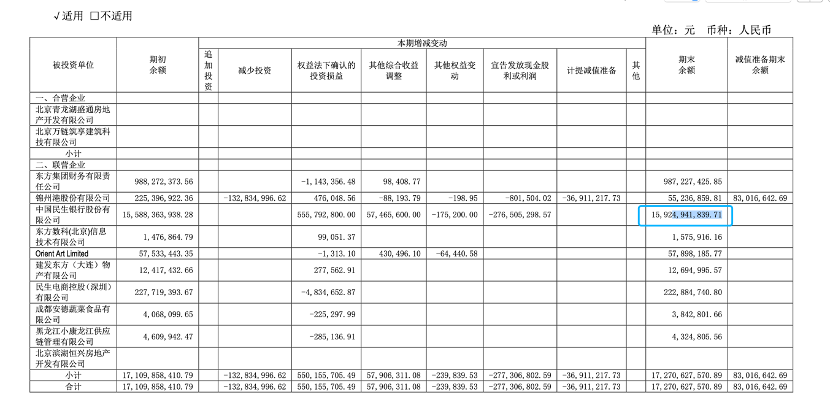 截至目前,东方集团在民生银行的持股比例为2.92%。根据2024年中报,东方集团持有的民生银行股权,按照长期股权投资确认的账面价值达到159.25亿元。
